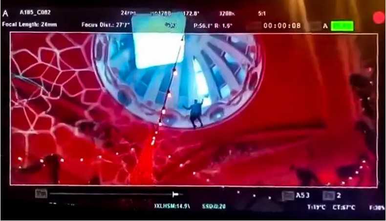 在剪辑中,莱斯利·格蕾丝的替身演员冲进一处看起来像是派对的地方,撞破了天花板的窗户,用圣诞树来缓冲自己的下落。(成龙行为)蝙蝠女从窗框上掉了下来,然后抓住了一棵鲜红的圣诞树,摇摇晃晃地落在地上。