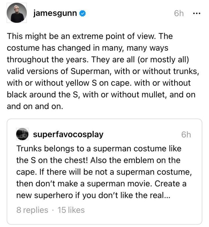 在Threads上,冈恩评论了粉丝们对于《超人:传承》服装可能性的反应,并透露了他对穿不穿短裤的超人辩论的看法。