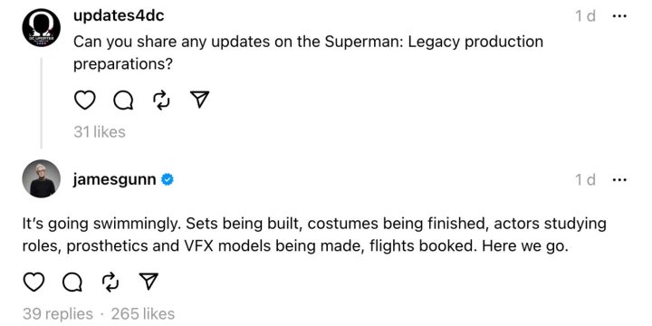 随着《海王2:失落的王国》为DCEU画上句号,新任DC Studios联席首席执行官詹姆斯·古恩毫不拖泥带水,迅速为2024年的《超人:传承》提供了一则拍摄进展。《超人:传承》将是冈恩打造的新DC Universe中的首部电影,该重启旨在为DC的电影系列注入新活力并焕发新生。目前关于《超人:传承》的细节还很有限,但冈恩为热情的影迷们带来了令人振奋的消息。