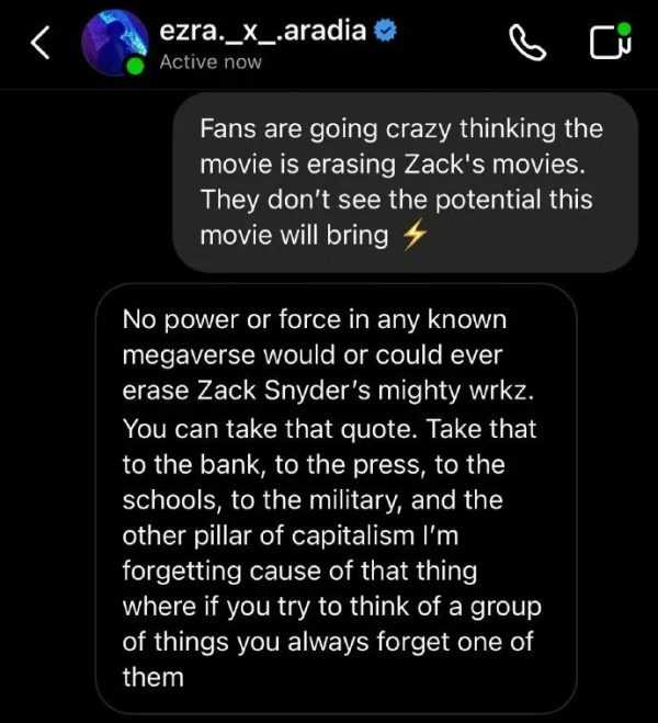 “在整个宇宙中,没有任何力量可以抹除掉扎克·施耐德的伟大作品。你可以引用这句话。把这话告诉银行,告诉媒体,告诉学校,告诉军队,告诉最后一个资本主义团体。”