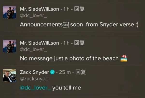 然后有个网友老哥问:“施奈德宇宙官宣在即”,“这条动态没有隐藏信息,只是一张海滩的风景图码?”然后扎导的回复耐人寻味:“你说呢?”