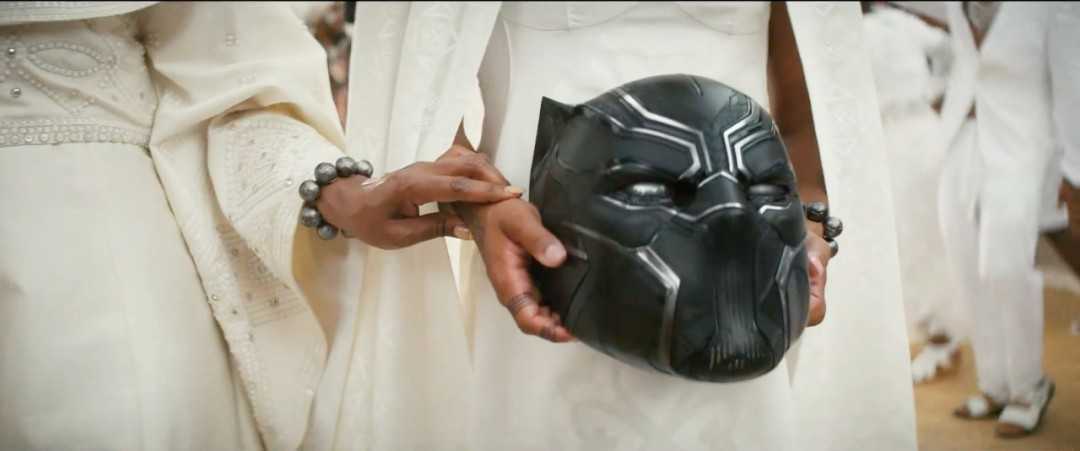 结合后面的镜头,站在拉曼达旁边,拿着黑豹面罩的是公主苏里,她拿着象征特查拉的黑豹头盔,为其进行送别。