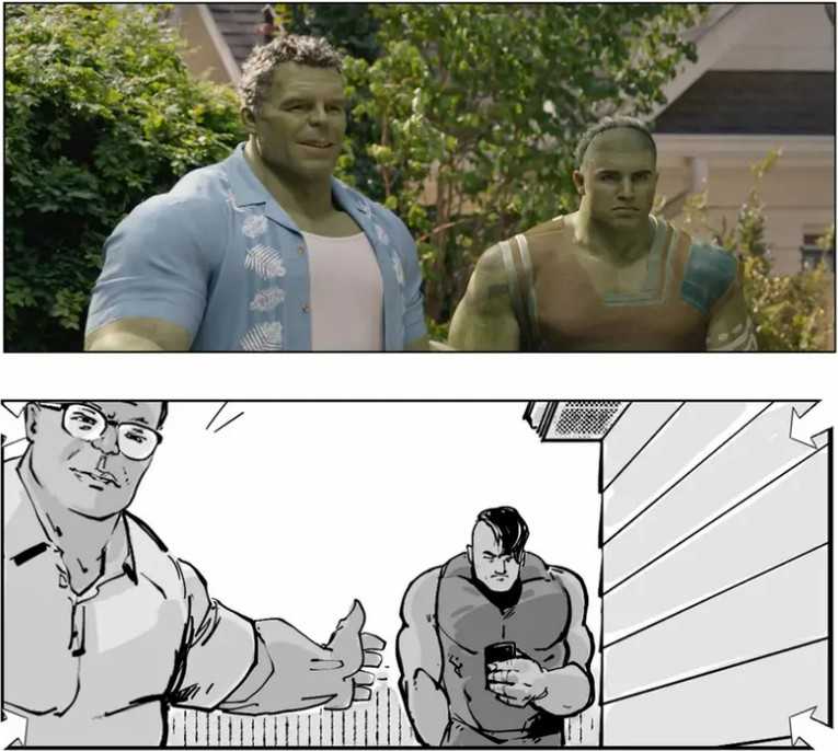 此外,在这张概念图中,还出现了一个完全不同的造型,班纳一边给他介绍,一边看着斯卡尔,一脸的反叛。