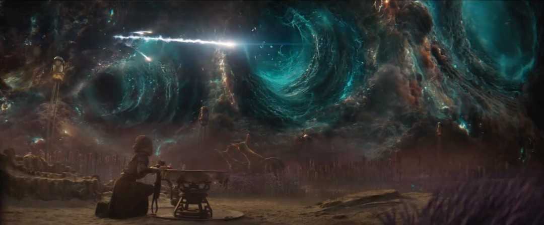 画面中,一个身穿斗篷的女子站在一台仪器前,望着天空中的陨石,如果她没猜错的话,这是珍妮特在《蚁人2》中,汉克为了找到珍妮特,冲进量子世界的场景。