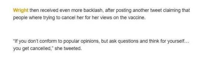 当然,还有一个原因,那就是媒体打了她的脸,因为她一开始就反对接种疫苗,但是美国的工会规定,必须要有接种证明才能拍电影。