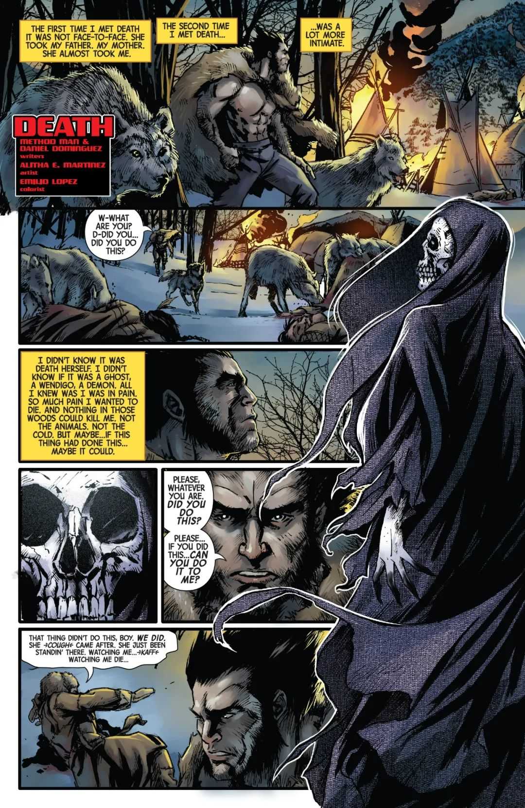 直到某天,罗根在一个被屠杀的原住民营地,遇见了死神,罗根央求死神结束他的生命,可死神却丝毫不理会罗根,一旁一个濒死的商人告诉罗根,死神站在那里只是为了等自己死去,因为自己是屠杀这个村庄的凶手之一,是罪大恶极之人,死亡要亲自收走他的灵魂,但是金刚狼不同,他无罪无欲,灵魂充满了迷茫,对于死神而言这种灵魂毫无价值。