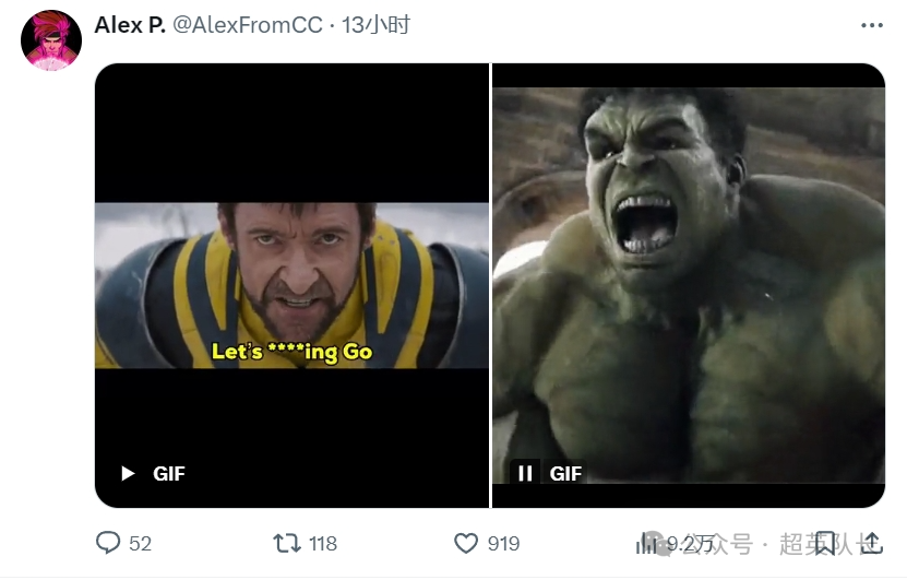 事情的起因颇为戏剧性,知名娱乐资讯平台thecosmiccircus的主编AlexFromCC在社交媒体上发布了两张引人注目的动图,一张是金刚狼,另一张则是绿巨人。然而,除了这两张图片,Alex并没有附加任何文字说明。