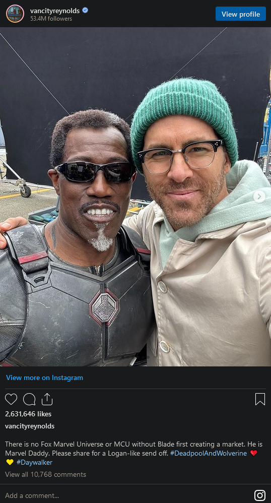 斯奈普斯的加盟不仅为影片增色,更让他自己成为了新的纪录保持者——他在漫威角色扮演生涯中的时间最长。杰克曼自2000年的《X战警》起就开始扮演金刚狼,而斯奈普斯的《刀锋战士》则早在1998年就与观众见面。杰克曼此前在《奇异博士与疯狂多元宇宙》中的客串,让他超越了X博士的扮演者帕特里克·斯图尔特,成为了纪录的保持者。