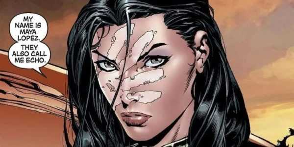 回声的父亲说她的“叔叔”会在空手道课后接她,然后一只神秘的手捏着玛雅的脸颊,还发出了熟悉的笑声。这人正是“金并”威尔逊·菲斯克,和剧集一样,漫画中金并收养了失去父亲的回声,将她培养成一名战士。