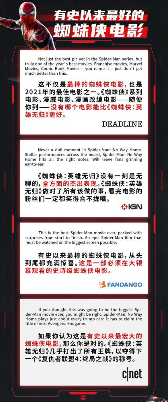 作为2021年最受瞩目的漫威超级英雄巨制,《蜘蛛侠:英雄无归》获行业媒体Deadline狂赞“这不仅是最棒的蜘蛛侠电影,也是2021年的最佳电影之一。”而Fandango则表示影片“从头到尾都充满惊喜。这是一部必须在大银幕观看的史诗级蜘蛛侠电影。”对于粉丝以及影迷来说,《蜘蛛侠:英雄无归》更被看成是“今年唯一值得在大银幕观看的电影”。有粉丝表示“它是一封献给蜘蛛侠及其粉丝的情书”、“为MCU开创了一个全新时代”。 不同国家的观众,感受也出奇一致,一起在影院欢呼、尖叫以及感动流泪,集体表示“超乎预料的惊喜”、“又笑又哭,一生只有一次的观影体验”。还有一些贴心的粉丝温馨提示“大家注意,避免剧透”。