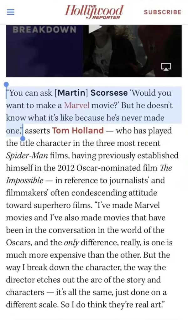 结果,这一段话被很多追求流量的人解读为,“荷兰弟怒斥电影大师马丁·斯科塞斯不懂漫威!”这标题党的流量简直是自带立场引战,估计很多人看到这个标题,可能进来内容也就不再关心了,直接开喷就是了~