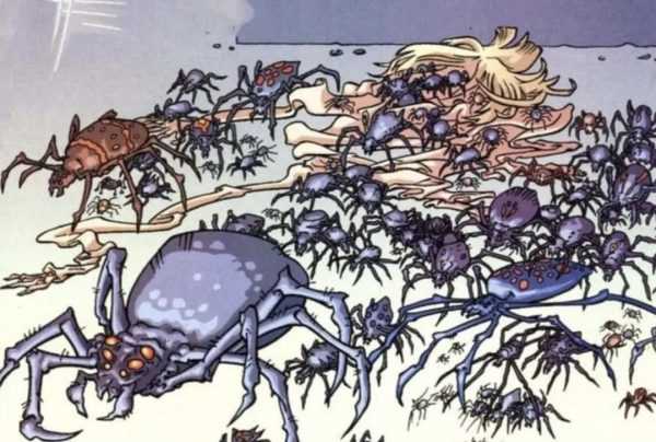 除了以上这些之外,其实在漫威宇宙中还有很多让人难以接受的角色造型,典型的就还有身有双蛆的“双蛆怪”、吃掉咬中蜘蛛侠的那只辐射蜘蛛后,整个人都变成了有N多小蜘蛛形成的“蜘蛛人”Carl King……