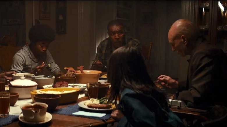 在这个场景中,罗根、X教授和劳拉来到了乡村公路边的一户人家里,三人与这家人共进晚餐。
