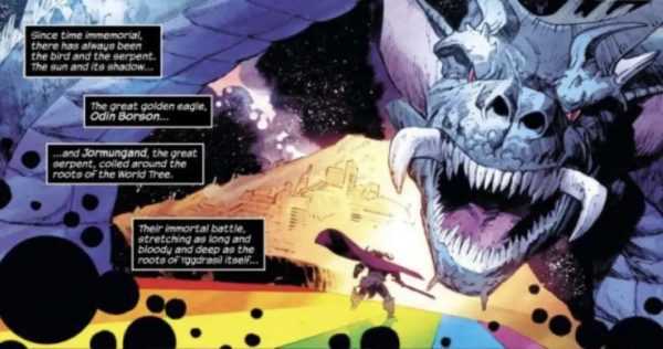 首先对于“尘世巨蟒”耶梦加得,比较熟悉北欧神话的粉丝应该比较清楚,这并非是漫威的原创角色,而是北欧神话中的怪物,在北欧神话中,“尘世巨蟒”耶梦加得是破坏及灾难之神洛基和女巨人安格尔伯达的次子(大儿子巨狼芬里尔、三女儿是死亡女神海拉),以首尾相衔象征着永恒的姿态环绕整个北欧神话世界。