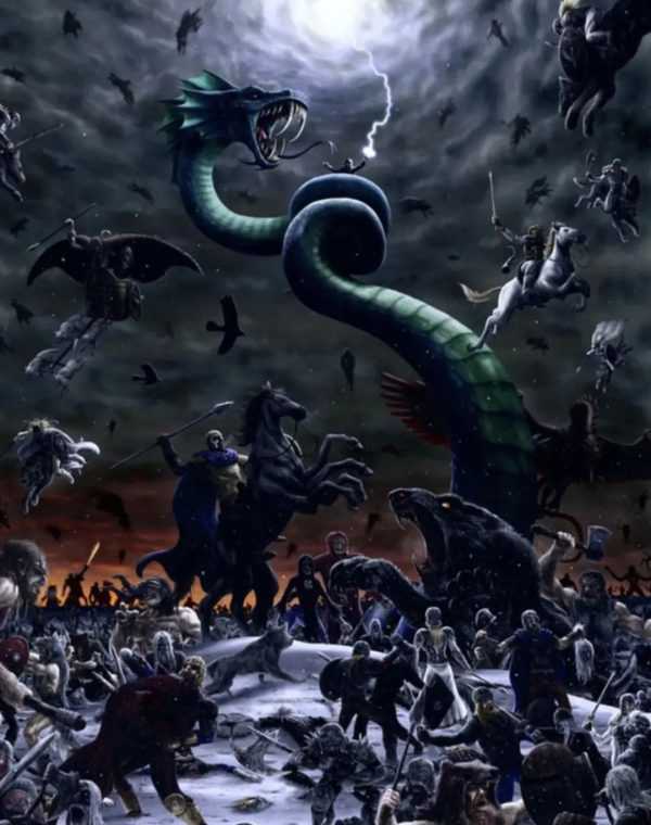 在北欧神话的想象中,人类居住的世界位于整个世界观中心,其具现化为一座庞大的城堡,而“尘世巨蟒”耶梦加得就是首尾相衔的姿态围绕着这一座城堡,而在「诸神黄昏」的时候,“尘世巨蟒”耶梦加得就会掀起滔天巨浪,制造末日之战,最终与雷神同归于尽。