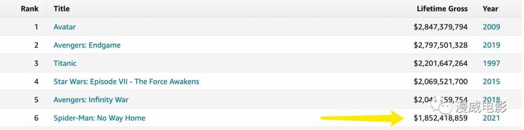 《蜘蛛侠:英雄无归》全球票房收入已经来到18.52亿美元,依然排在全球总影史的第六位。