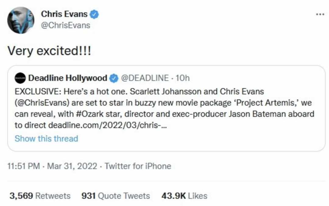 克里斯·埃文斯转推“斯嘉丽·约翰逊与埃文斯将合作热门新片项目《阿尔忒弥斯计划》”的消息,表示: