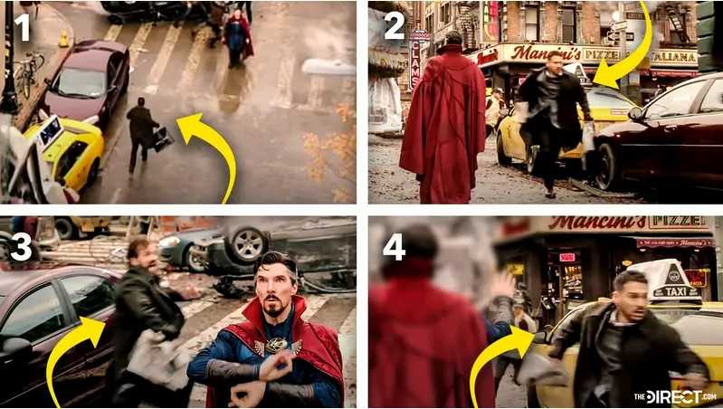 Twitter 用户@honeymoron 发现,有一个配角路人曾在奇异博士身边前后四次经过,通过预告可以看出,当奇异博士看到公交车时,黑西装路人第一次经过。