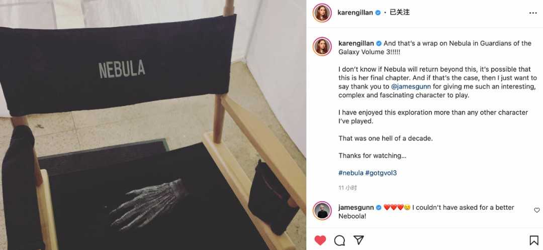 饰演“星云”的演员凯伦·吉兰发ins宣布自己在《银河护卫队3》中的戏份也杀青啦。