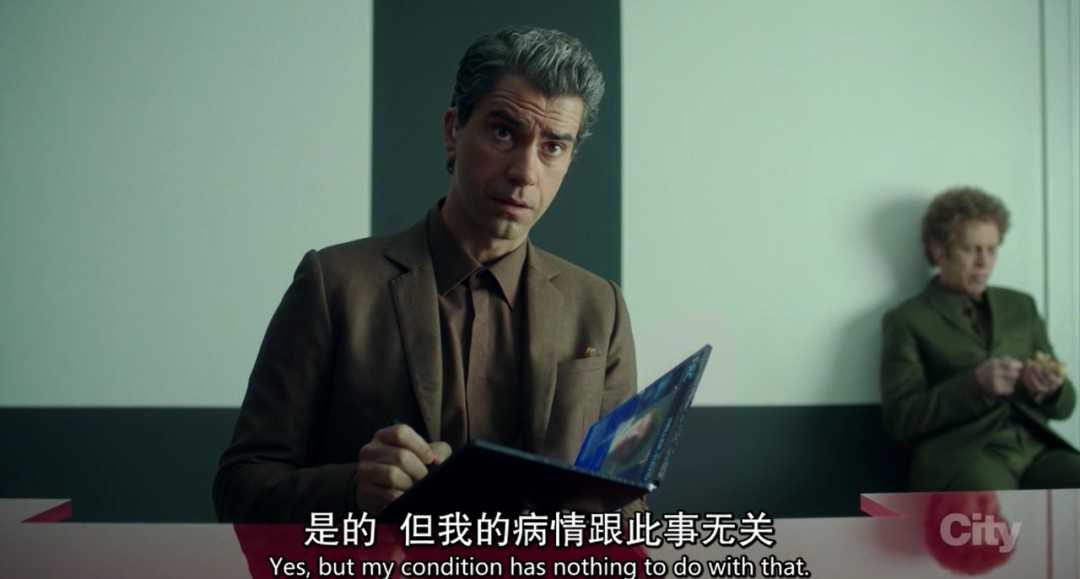接着在一个快速闪过的画面中,出现了一个大头西装男,这里提前剧透一下,这个人其实是大卫对时间线A(更早过去)的回忆,而大头男是本剧的反派影王的一个化身,同时也是导致大卫如此痛苦的因素。