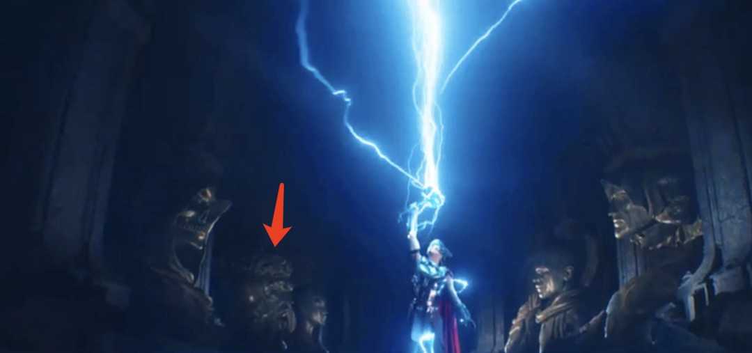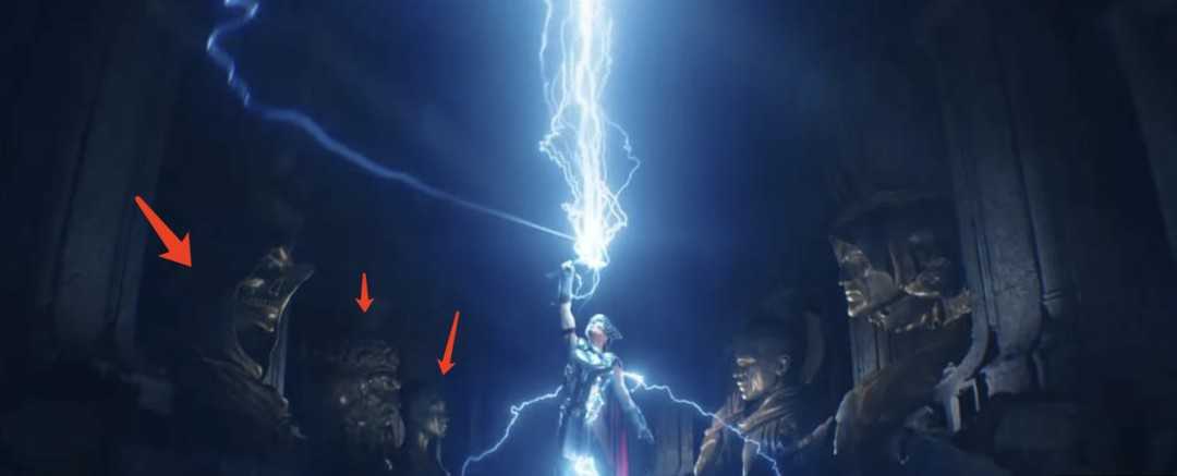 另外一个比较关键的设定就是,预告中女雷神所处的环境里,曾非常明显的有类似于“神殿”的场景设定,而且,这一处设定中也是出现了不少漫威宇宙的经典神明面孔!