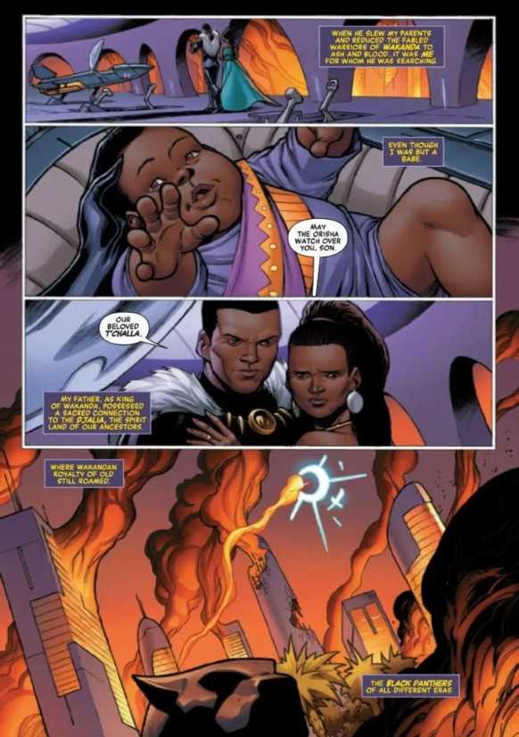 故事是这样的:特查拉的父母死于基尔蒙格国王手中,基尔蒙格摧毁了瓦坎达并屠杀了所有国民,特查拉的父母拼尽全力将婴儿特查拉放进了一艘逃生火箭中,最终在婴儿特查拉的注视下,父母被射杀。