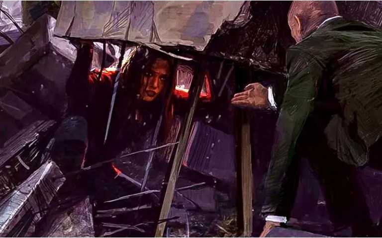 教授穿的是西装,单膝跪地,838 的旺达害怕地看着查尔斯,而在瓦砾背后则是丧尸旺达,这应该是主世界旺达在精神世界的投影。