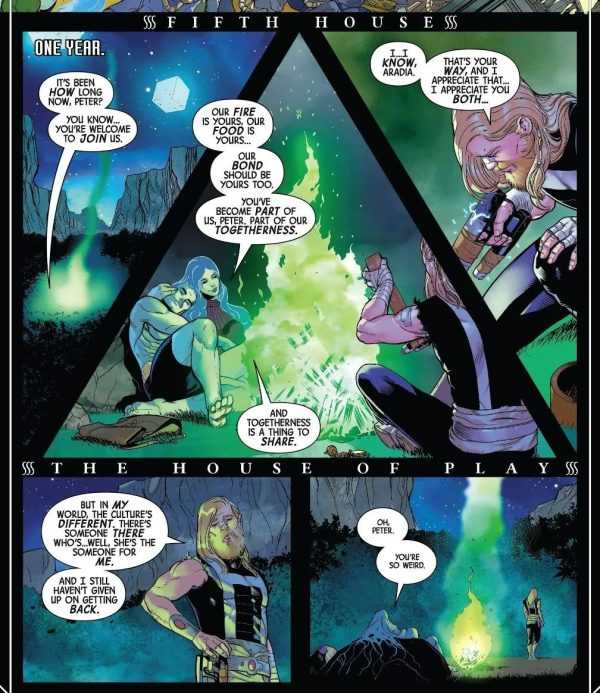 就这样,星爵持续一百多年的三人恋就此结束,对于这段感情,星爵承认他和 Aradia 和 Mors 的关系,其实和他与卡莫拉的关系没什么不同,但他心中还是放不下,最终选择了离去。