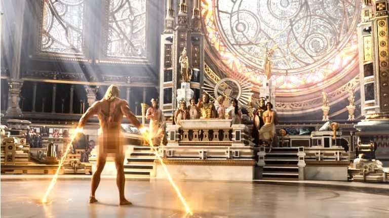 在《雷神4》预告中,潜入奥林匹斯的雷神被发现,在主舞台上被宙斯当中扒掉了所有的衣服,而给到的画面还专门给锤哥的下半身打了一个马赛克。