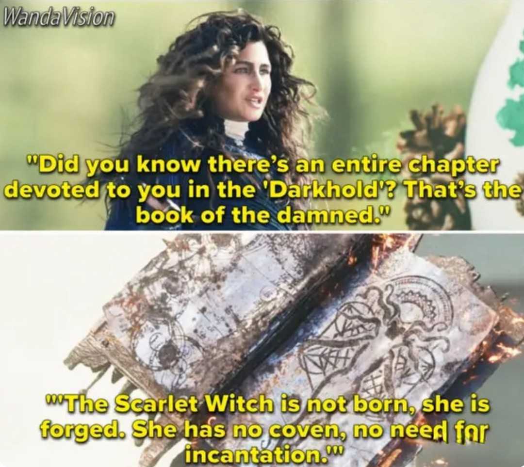 出现在她身后的雕像,很像在《旺达幻视》中出现在黑暗神书里的那个。