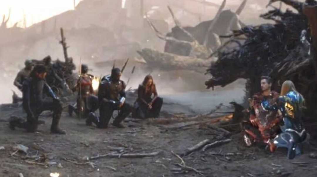 另外一个则是在大战之后,面向钢铁侠尸体,一众复仇者英雄单膝跪地送别斯塔克的场景。