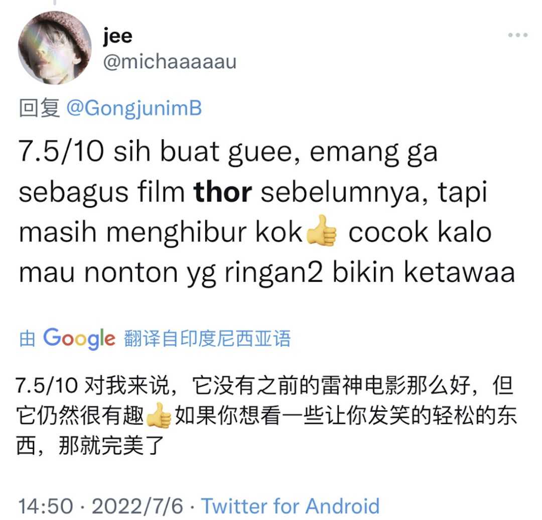jee:7.5/10对我来说,它没有之前的雷神电影那么好,但它仍然很有趣,如果你想看一些让你发笑的轻松的东西,那就完美了。