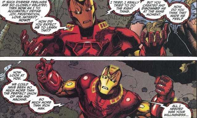 钢铁侠的战甲向来就有人工智能的辅助,但在漫威《钢铁侠》第3卷的剧情中,就有过设定钢铁侠的战甲在意外遭到闪电击中后,竟然衍生出了超越人工智能的自我意识。