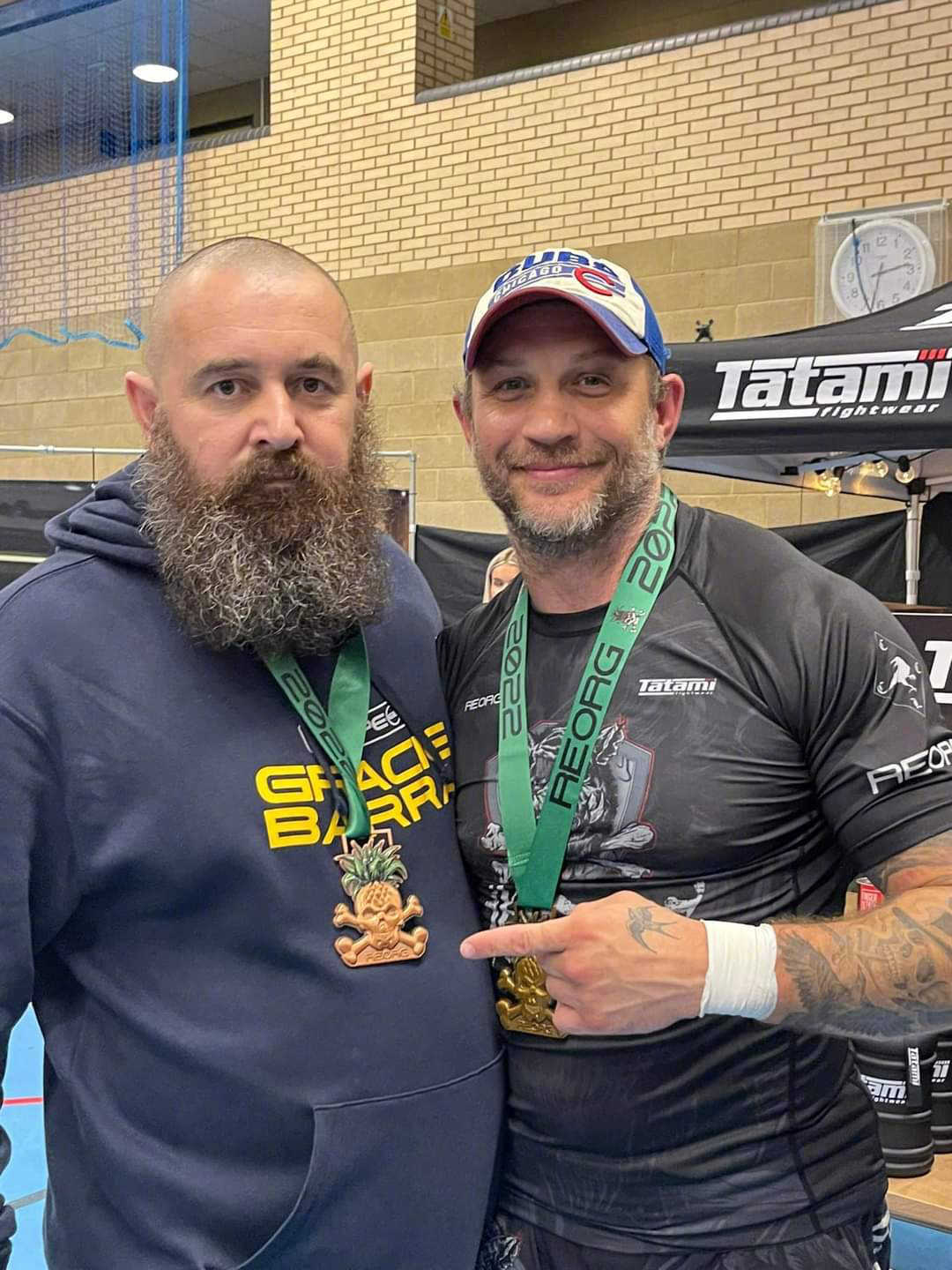 微信关注,获取更多 日前,影星汤姆·哈迪参加了在英国举行的首届REORG巴西柔术锦标赛,以蓝带的身份参赛的汤老师,最终在Gi(传统道服)和No-Gi(无道服)两个组别均获得金牌!据悉,汤老湿于2011年参演MMA影片《勇士》后开始接触巴西柔术,并会偶尔接受训练,如今是四道蓝带(入门者),接下来有望拿下紫带(初步掌握了所有技术者)。