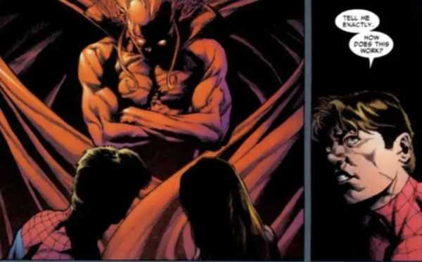 墨菲斯托以蜘蛛侠和玛丽·简的婚姻爱情为交易条件,只要彼得·帕克同意,墨菲斯托就能够让梅姨转危为安,最终,在玛丽·简的理解下,彼得·帕克同意了这一恶魔的交易。