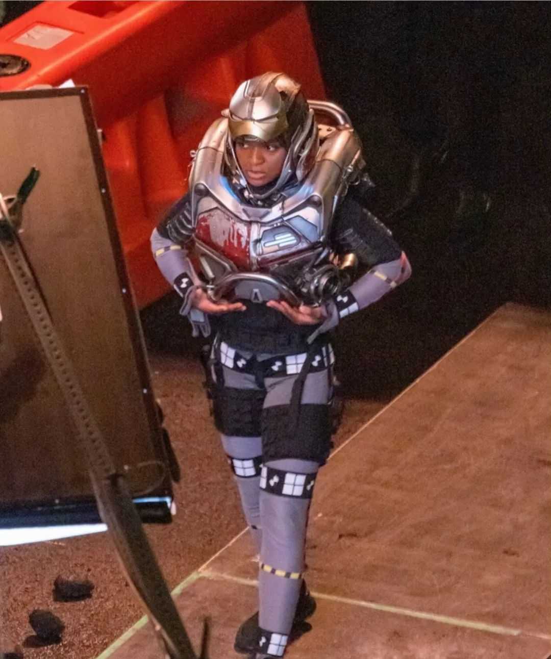 再仔细看的话,能看到背后似乎还背着跟猎鹰类似的背包,并且形状也是爱心标志,不知道具体的作用是什么不过最让我吃惊的是左右手两边的武器,按理说,在《黑豹2》的预告里,钢铁之心莉莉和苏睿两人都是天才少女,并且是好朋友,在瓦坎达对外开放后,苏睿分享一些振金相关的技术也无可厚非,但左右手这个武器如果用在振金的战场上,是不是有点太寒碜了些?如果说右手的武器发射器还说得过去,那左边的类似电锯一样的东西确实显得太拉垮了,时代变了大人
