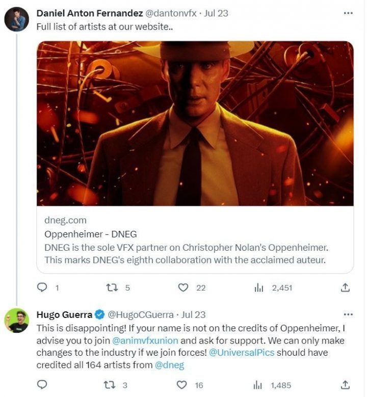 “真是让人大失所望!如果《奥本海默》的片尾曲中没有你的名字,那么我建议你去找动画和视觉效果联盟,向他们寻求帮助。我们必须团结起来,才能扭转这个局面!”