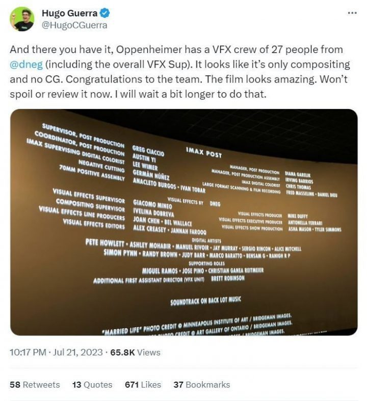 《奥本海默》上映后,在好莱坞工作了二十多年的 Hugo Guerra,在7月21号的傍晚,在自己的微博上发了一条微博,并附上了一份特效团队的列表,他写道: