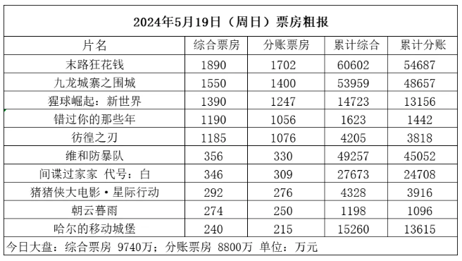 随着5月19日(周日)的落幕,全国影院共安排了42.7万场放映,吸引了约239万观众走进影院,根据初步统计,当日票房达到了9740万元。