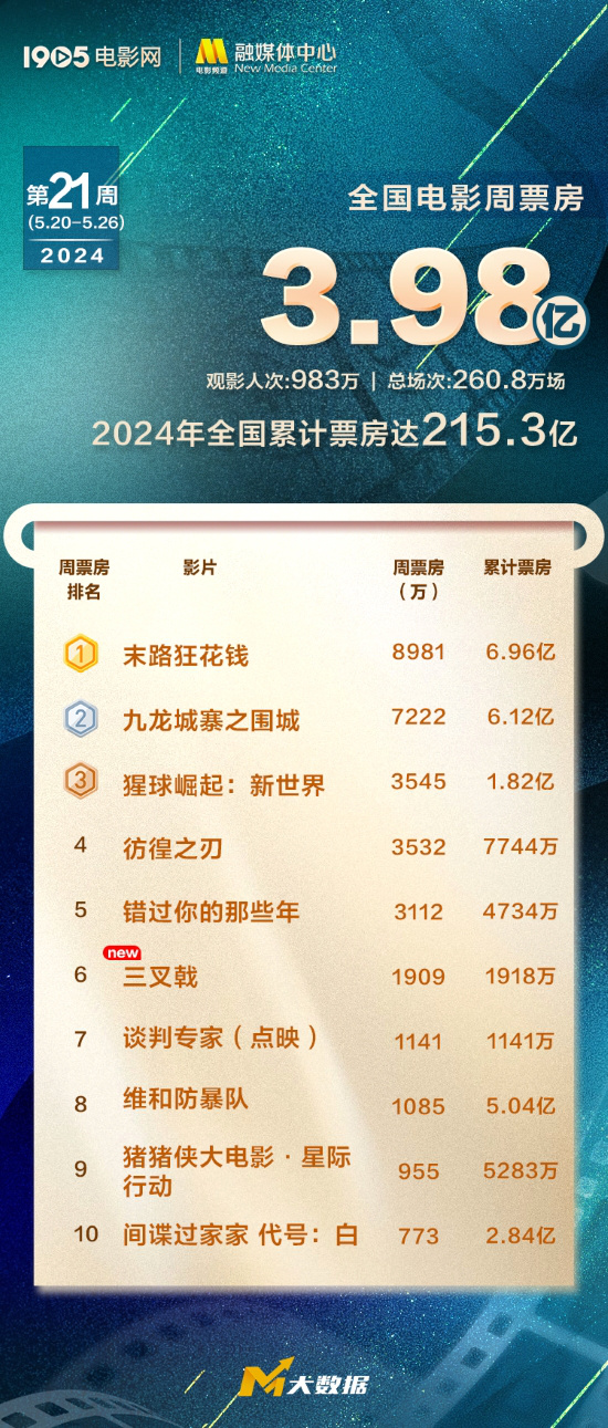 随着2024年第21周的落幕,全国电影市场再次迎来一轮票房热潮。据最新统计数据显示,本周全国电影票房达到惊人的3.98亿元,观影人次高达983万,总放映场次突破260万场。而截至本周,2024年全年的电影票房累计已达到215.3亿元,这一数字无疑为电影行业注入了一剂强心针。