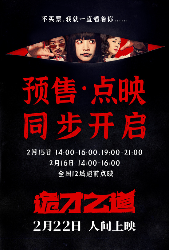 近日,一部名为《诡才之道》的惊悚喜剧电影发布了其主题曲《鬼才出道》的MV及海报,并宣布将在全国十二个城市——北京、上海、深圳、广州、成都、重庆、武汉、西安、杭州、苏州、南京和郑州开启超前点映。这部电影的故事起源于一个编剧的独特创意:如果装“鬼”吓人也有业绩指标,那么会发生什么样的故事呢?影片由陈柏霖、张榕容、王净、姚以缇等一众明星主演,定于2月22日在全国影院上映。