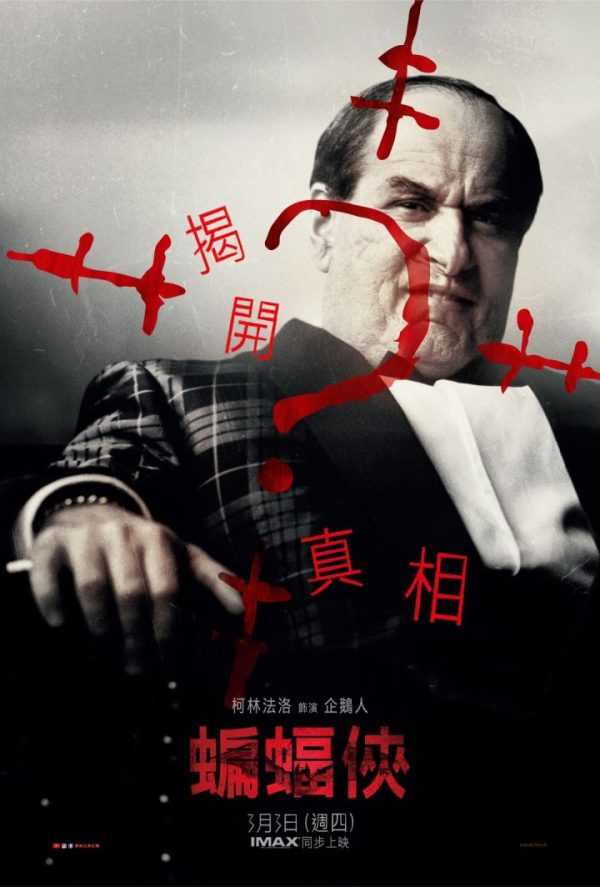片中另一个反派是长久以来受到欢迎的企鹅人,他是高谭市最夯夜总会“冰山俱乐部”的老板,言语粗鲁、阴险狡诈,是个隐藏情绪随时准备爆发的狠角色。虽然现在在黑道老大卡麦法尔康尼底下做事,但他绝对有着更大的野心。科林·法瑞尔也为了这个角色完全改变自己,除了外观上的变化,他也呈现不一样的说话方式,在片场没人能认出科林·法瑞尔来。