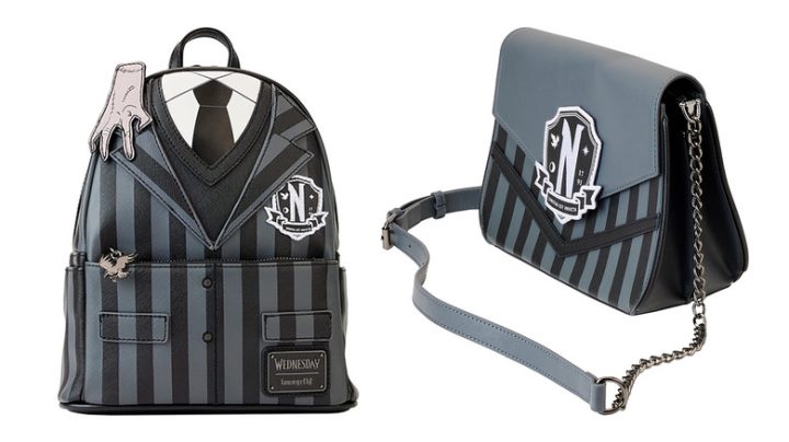在Loungefly,星期三从Nevermore Academy的黑暗时尚感转化为一系列相配的包袋和配饰。