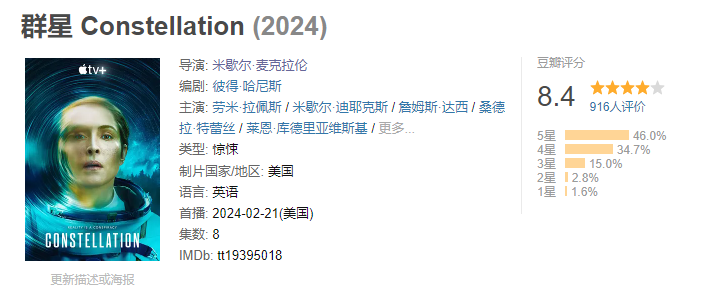 《群星》共计8集,首日上线就放出了3集。目前,豆瓣上的最新评分为8.4分,五星好评占比最高,约为46%。这部剧集以其悬念十足的剧情和烧脑的故事吸引了观众的目光。