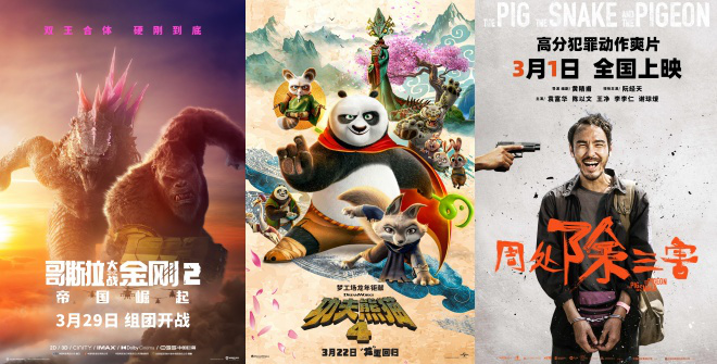 《哥斯拉大战金刚2:帝国崛起》作为一部视效大片,其视觉特效给观众带来了震撼的观感,一定程度上弥补了剧情不足的遗憾。该片是2024年内地影市首周票房表现最好的进口电影,累计票房高达12.32亿元。而《功夫熊猫4》作为系列作品第四部,其叙事结构和故事内容并没有给市场带来太多惊喜,豆瓣评分仅为6.5分,创造了系列作品口碑新低。